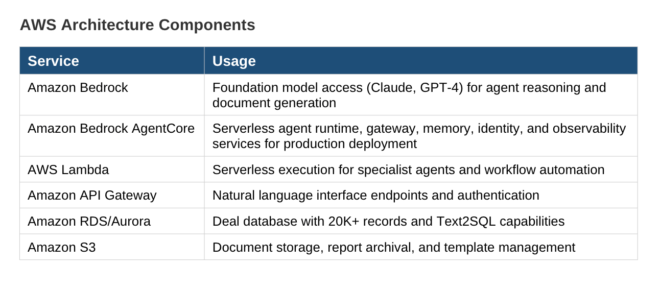 - AgentCore Gateway: Automatic conversion of APIs and Lambda functions into agent-compatible tools, enabling seamless integration with the deal database and MCP connectors for XLSX/PDF processing.